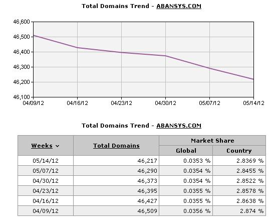 Conclusión, si podéis evitar esta empresa, no lo dudéis, ya que no tiene pinta de ser un caso aislado el nuestro.Como podemos comprobar en la gráfica siguiente, el descenso en tan poco tiempo del número de dominios que gestionan es considerable (www.webhosting.info):