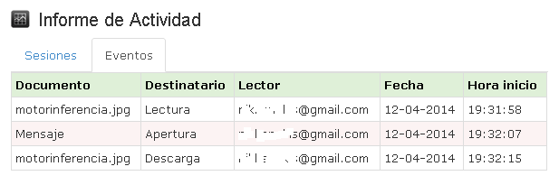 - Sesiones: genera un informe sobre el tiempo que el destinatario transcurre leyendo cada página de nuestros adjuntos.