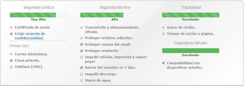 La aplicación está implementada sobre un potente servidor DRM (Digital Rights Management) que protege tanto el mensaje como los documentos adjuntos. Utiliza encriptado AES-256 y la información viaja en todo momento cifrada con SSL. Entre muchas opciones de seguridad incluye protección anti-copia, marca de agua, derecho de revocación, autodestrucción del mensaje, etc.
