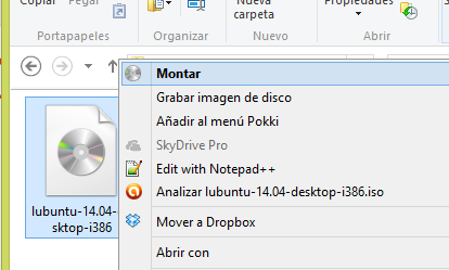 Tan sencillo como hacer clic derecho sobre el fichero de imagen ISO, y a continuación seleccionando «Montar«.