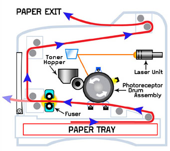 La impresora láser tiene un sistema semejante al de una fotocopiadora. Esta impresora funciona con tóners de tinta, no con cartuchos, cuya tinta consiste en un tipo de pigmentos triturados y convertidos en polvo, algo aceitoso. La impresión se realiza mediante un cilindro fotosensible el láser que graba el contenido a copiar mediante una carga electroestática. Al pasar por el depósito del tóner, los pigmentos se adhieren, dejando caer el polvo, que es fijado al papel con un rodillo de calor.
